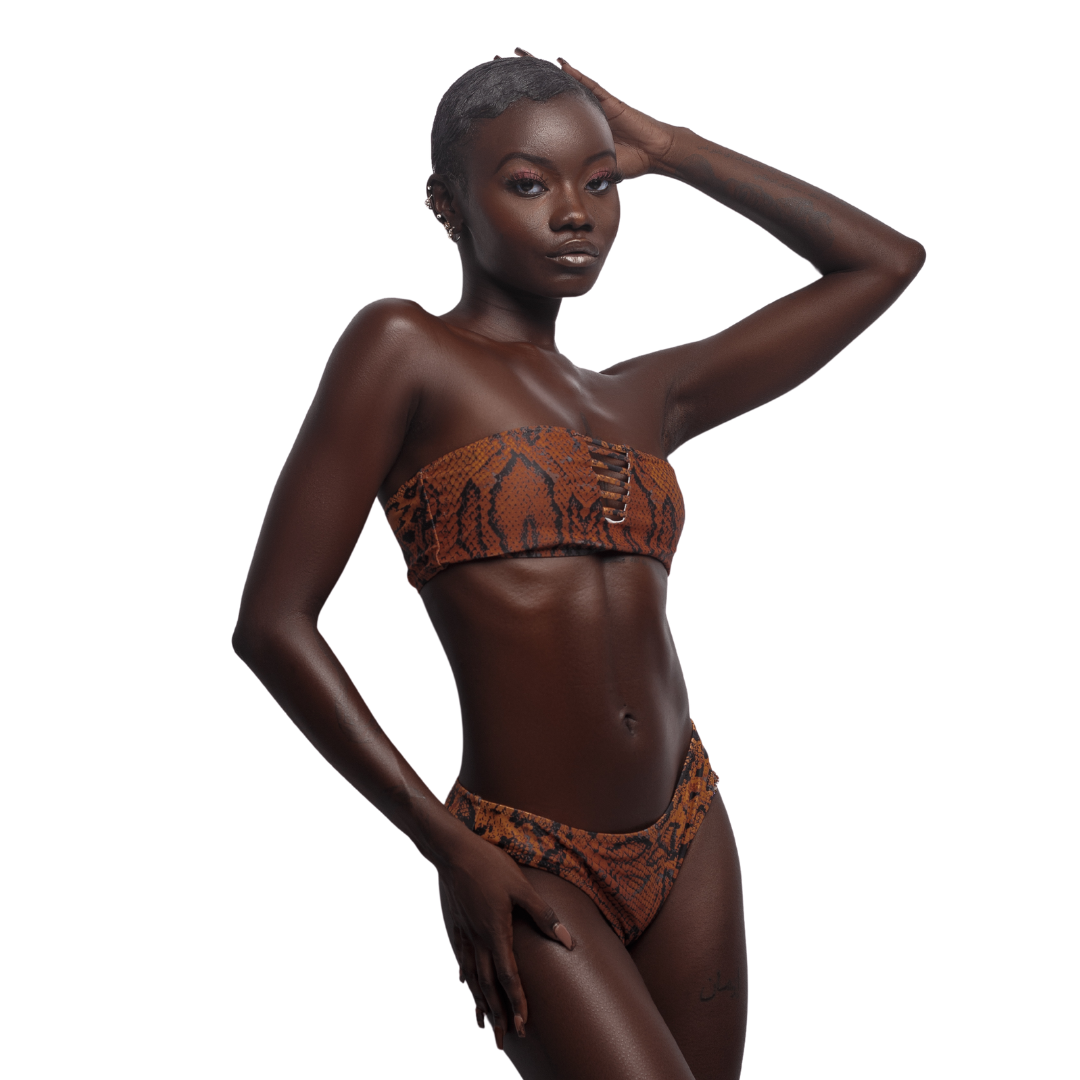Discover a diverse selection of unique fabrics and textures, along with our bikinis featuring metallic hardware detailing.