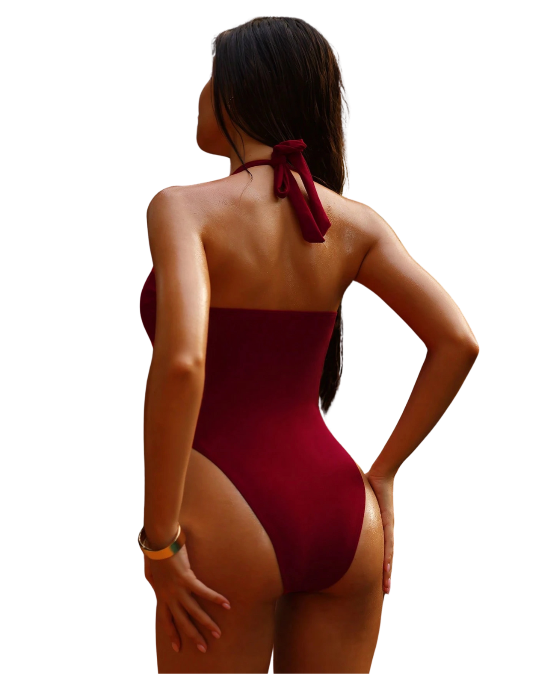 INFO: A gorgeous wine red monokini with a deep plunge and high cut, with cheeky bikini bottom. Comes with matching wine red sarong. Stretchy and sensual with a halter tie top.