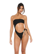 INFO: A classic all-black asymmetrical monokini with sleek fabric and side detailing with strapless/bandeau upper portion. Featuring cheeky bikini coverage at the back and a high-cut front for a flattering, timeless look.
