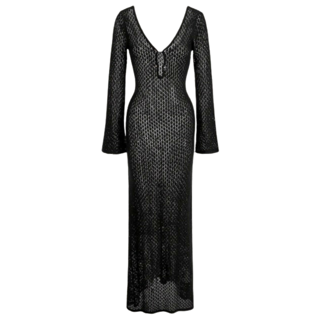 INFO: A stunning black mesh maxi dress with elegant bell sleeves and a deep V-neck plunge detail in the front. The open lower back adds a touch of allure, while the lightweight, breezy fabric makes it the perfect coverup to layer over any bikini style or color.