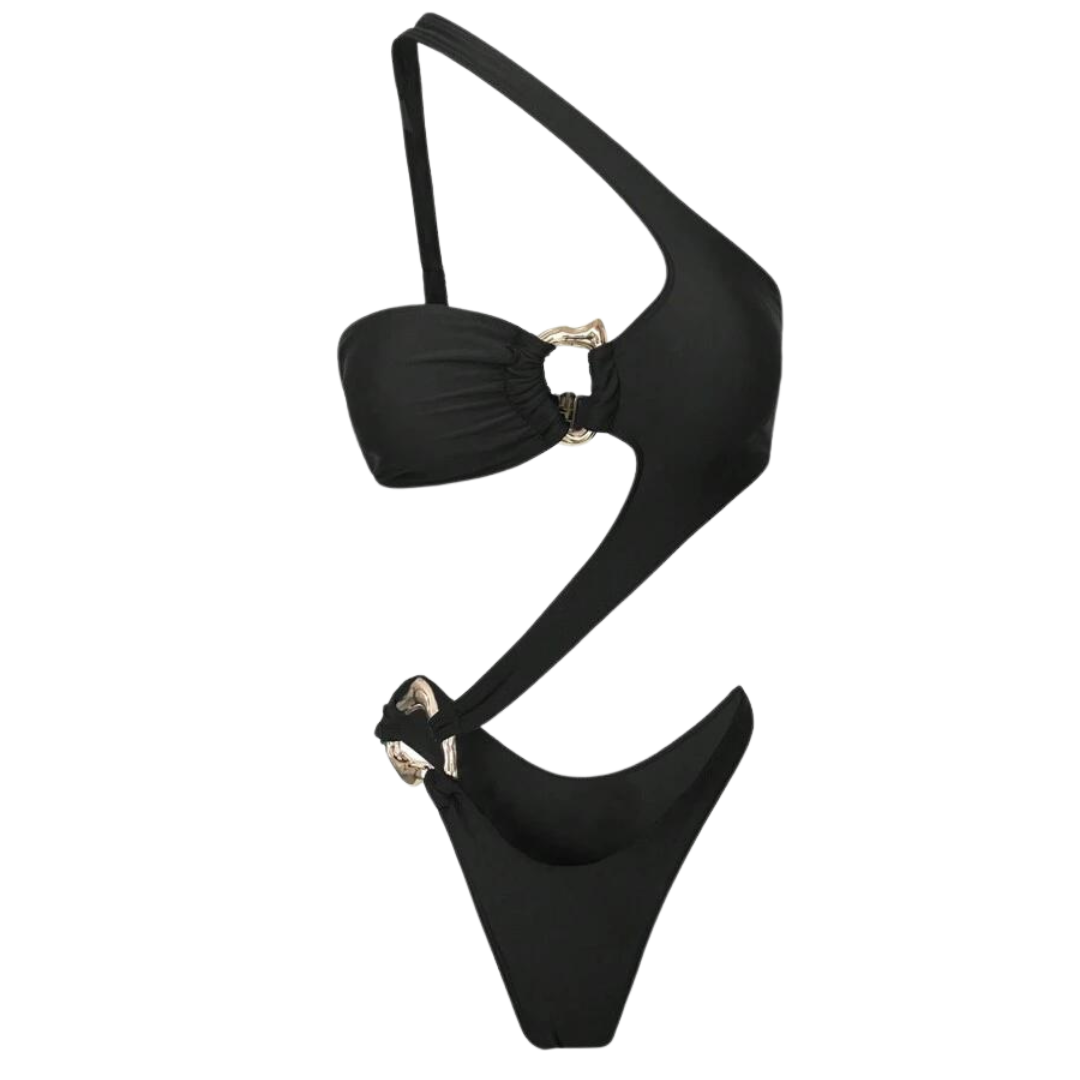 INFO: Discover one of our most daring monokinis yet, featuring gold circular accents and a high-cut bottom for a bold, flattering silhouette. The asymmetrical top includes removable inserts for customizable support. Sleek, sexy, and perfect to pair with an all-black sarong for a striking look.