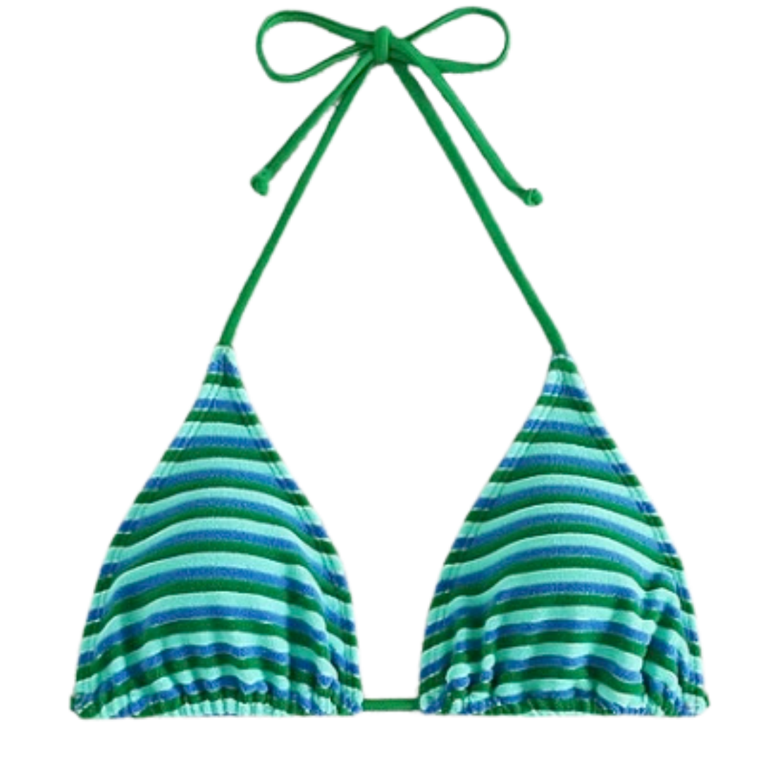 INFO: A vibrant ocean-inspired striped kini featuring triangle cups, a halter top, and adjustable fabric at the front to customize coverage. Removable cups for added versatility. Pair it with the Palm Kini bottoms for a complete look, or opt for a black or white bottom to keep it simple.