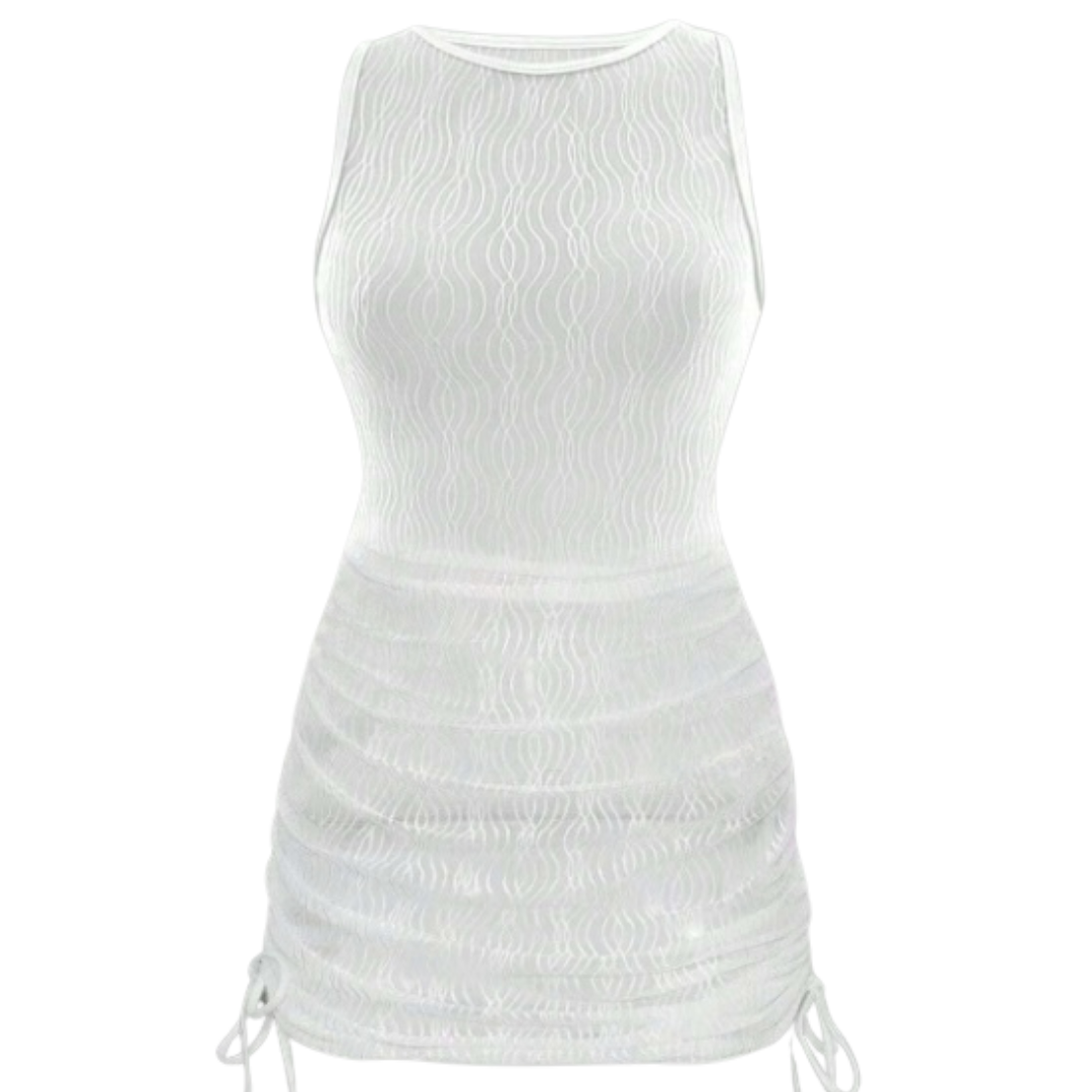INFO: A gorgeous sheer high-neck flowy dress with side ties that allow you to adjust the length by tightening or loosening the fabric. Perfect for layering over a monokini or bikini, this lightweight dress offers sun protection while seamlessly transitioning you from the beach to a restaurant or hotel.