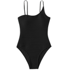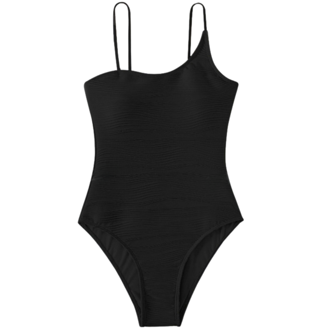 INFO: A classic all-black asymmetrical monokini with sleek fabric and side detailing with strapless/bandeau upper portion. Featuring cheeky bikini coverage at the back and a high-cut front for a flattering, timeless look.